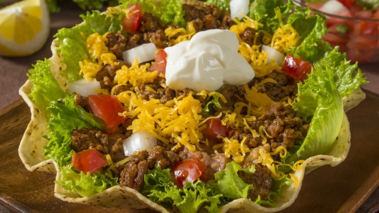 A staple of 1990s menus, when we all started to broaden our culinary horizons, the taco salad is something you should probably never order — in a Mexican restaurant or anywhere else. According to Mexican cookbook author Pati Jinich, the taco salad was first popularized by Doritos creator Elmer Doolin in the 1960s (via The Washington Post). That first iteration was little more than a deep-fried Dorito bowl filled with ground meat, cheddar cheese, and sour cream — what Jinich describes as the typical North American ideal of Mexican food at the time. She goes on to say that while it was an important moment in Tex-Mex history, it's certainly not the salads that Mexicans are eating.