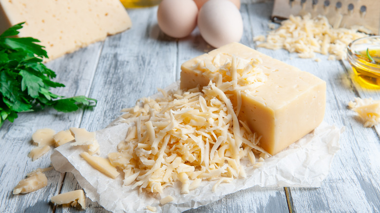 Once you've chosen your cheese, it's time to get it ready for fondue. This step is important for achieving great texture. Grating the cheese or cutting it into smaller pieces creates a smoother texture and helps the cheese to melt evenly (via Nigella). When grating the cheese, use the larger holes on a box grater for a coarser texture, or the smaller holes for a finer texture. Whether grating or cutting the cheese, be sure to stick to one size.