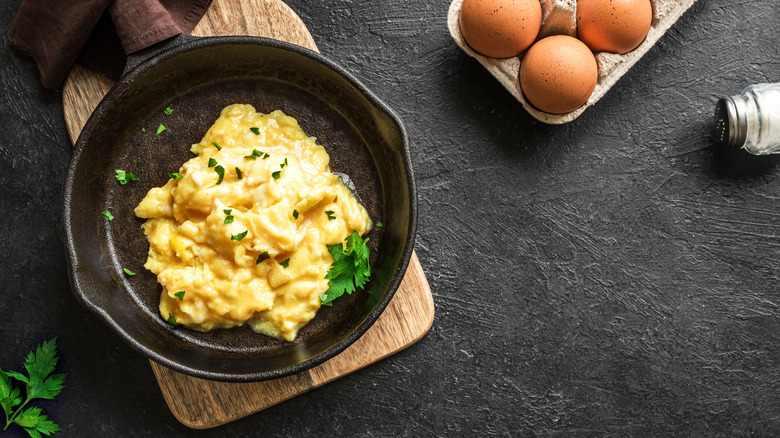 On YouTube, Lagasse explains that there are three things you need to do to create the perfect scrambled eggs. First, he recommends adding a little cream and whisking it in with your eggs before cooking them. Add butter to a nonstick pan over medium-high heat. After the butter is melted, put in your eggs mixed with cream and let them cook until the edges are set. Use your rubber spatula to move the eggs around your pan until you are pleased with how they have cooked. For the final touch, serve these eggs on a warm plate with desired toppings and accompaniments to amp up your scrambled eggs.
