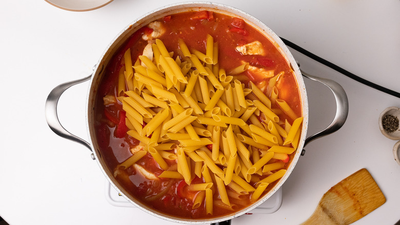 - Toss in the can of chopped tomatoes, chicken stock, penne pasta, and salt and pepper to taste. Cover with a lid, and allow the pasta to cook for 8 minutes, or according to the package instructions.