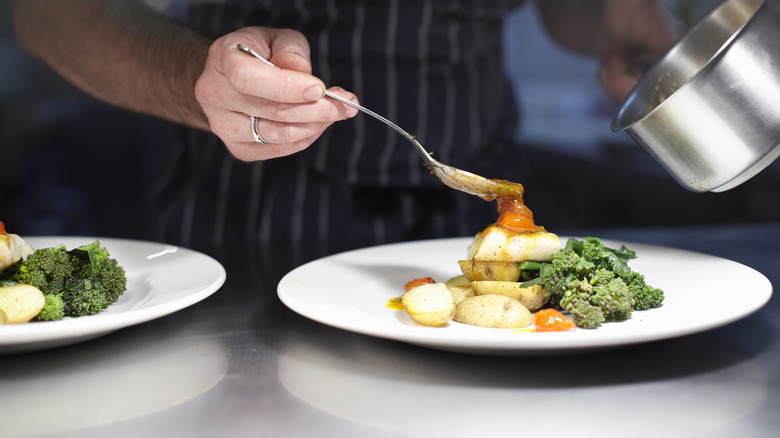 In the traditional brigade, each chef de partie is responsible for a different component of the dish and at the moment of plating, all the pots and pans containing sauce or sauteed vegetables are sent to the pass to be plated by the sous chef. Only a chef with such a senior role could be able to perform such a complex and important task. If the executive chef needed to walk away from calling out orders, the sous chef would move into that role, and another chef in the kitchen would pick up the plating.