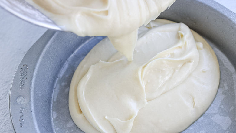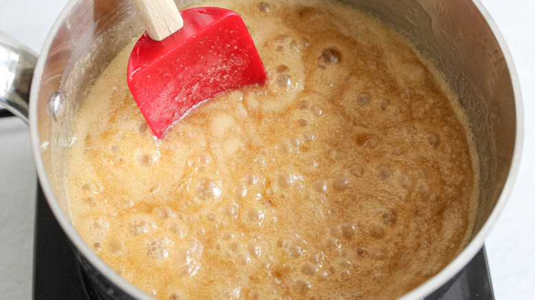 "The cake itself is pretty simple, but the frosting can be tricky because you want to make sure you don't cook the caramel [for] so long, that it burns," Morone notes. "Cooking it 3 to 5 minutes after it starts boiling is ideal — longer than that, and it could end up tasting burned." Remove the pan from heat, and pour the caramel sauce into a bowl. Let it cook for about 10 minutes, until it's lukewarm.