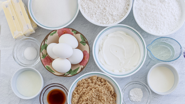 Once you're ready to begin, you will need to head to the grocery store, and grab the necessary ingredients. Pick up unsalted butter, granulated sugar, vegetable oil, sour cream, large eggs, cake flour, baking powder, salt, vanilla extract, brown sugar, buttermilk, heavy cream, and powdered sugar.