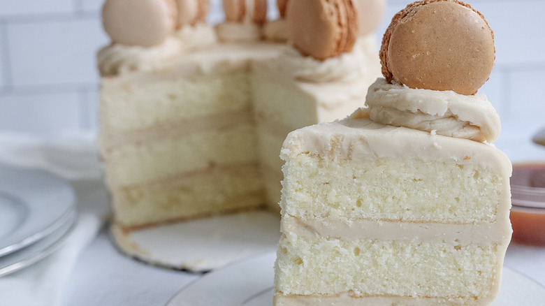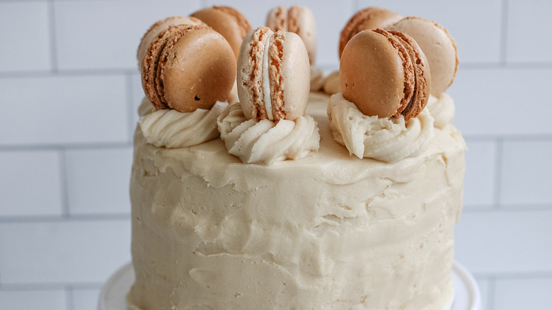 Add the caramel mixture, 2 teaspoons vanilla extract, and powdered sugar to the bowl of a stand mixer, beating until the frosting become smooth and fluffy. Then, add the frosting over each cake layer, and on the top of the cake. Add any desired decorations on top of the cake, such as macaroons.