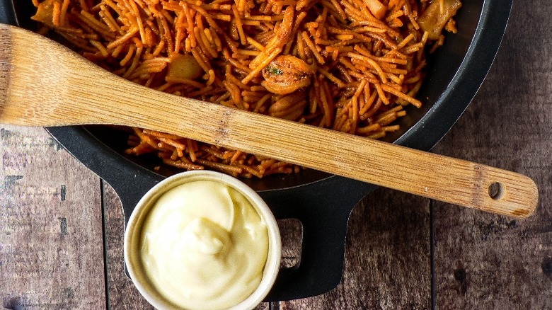 Historically, true aioli has been made by combining smashed fresh garlic cloves and flavorful olive oil, whipping them in a mortar and pestle until aerated, emulsified, silken, and fluffy. Through the years, aioli like this has been used to add and intensify flavors, or mask unpleasant ones on everything from meat, fish, and vegetables, to sandwiches, eggs, and more, according to The Food Timeline.