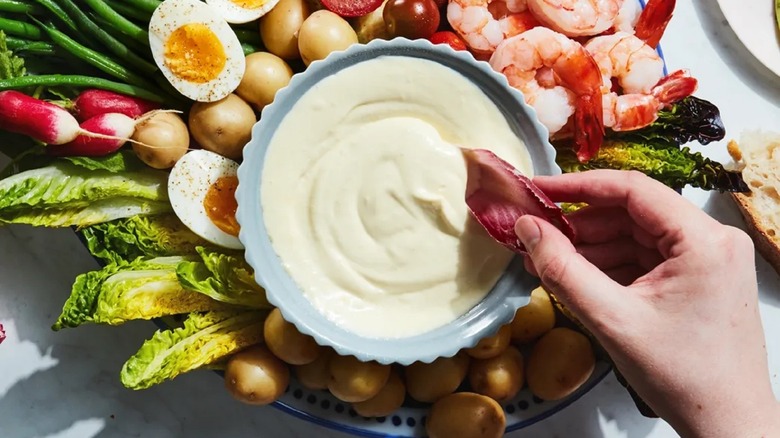 Besides being a great topper or dipper, aioli is also a wonderful celebratory dish on its own, called Aïoli Garni, which includes things like beef or boiled chicken, salt cod, and a variety of seasonal vegetables all served with a big bowl of aioli at its center (via YouTube). Also called Aioli Monstre or La Grand Aïoli as The New York Times Magazine reports, it is, "a dearly respected communal eating tradition in Provence," that historically coincided with the garlic harvest.