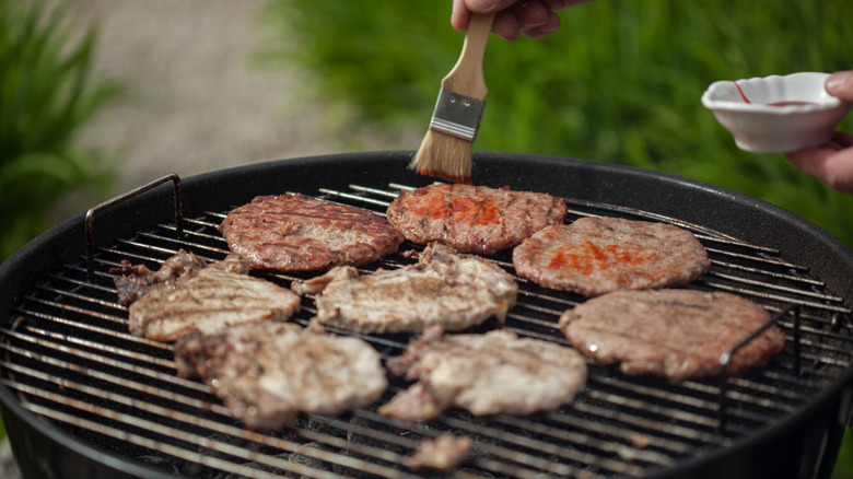 As you mix up your burger meat with any seasonings you're working with, consider adding cola to your burger meat to add some sweetness. Additionally, as your burger finishes its cooking process, you can combine the already flavorful French dressing with this beloved soda and brush it right on your burger toward the end of cooking. This will not be a thick enough sauce or something close to a barbecue sauce, but it will add some moisture and sweetness as a kind of baste. When choosing your cola, be sure to get the full-fledged stuff rather than the diet options to ensure both flavor and caramelization.