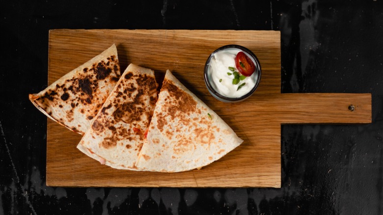 Now, you get to decide how to dress your quesadilla burger. We recommend sauce, lettuce, and tomato. For the perfect sauce mixture in this recipe, combine mayonnaise, chipotle peppers, and lime juice and adjust those flavors to your liking. Put down your other tortillas, add some shredded cheese on top of those, and allow the cheese to melt before putting them on top of your dressed burger. Finally, slice those up and serve with extra pico, guacamole, and a dollop of sour cream.