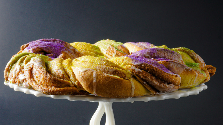 Best described as a type of pastry, king cake has the flavor profile of an iced cinnamon roll, the texture of an enriched babka, and the appearance of a closed-circle Kringle. Typical king cake accompaniments are neon-colored sugar and "the baby," a minute plastic baby figurine that is buried within the tasty swirls of the king cake interior. Flavorful twists on the beloved pastry are often a throwback to other New Orleans delights, like praline pecan king cake or Bananas Foster King Cake. With these decadent desserts in mind, you may be forgiven for thinking that king cake's origins are firmly rooted in its crescent city home.