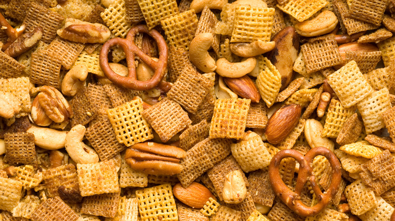 Yes, you should hang onto any and all leftover biscuits, not for the morning but for the evening. To get your biscuits party-ready, Day recommends cutting them into cubes and popping them onto a baking tray (via Epicurious). You'll want to bake them for eight to 12 minutes or until they turn a beautifully golden hue. As for other mix-ins? Day's recipe calls for cereal, pretzels, pecans, and sesame seeds. Douse the whole concoction in a spiced, buttery sauce, and bake it one final time.