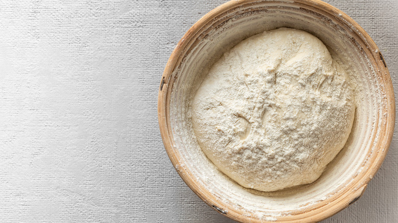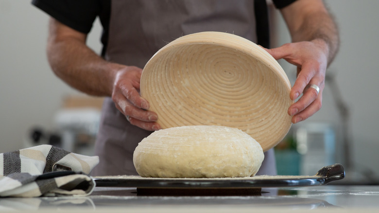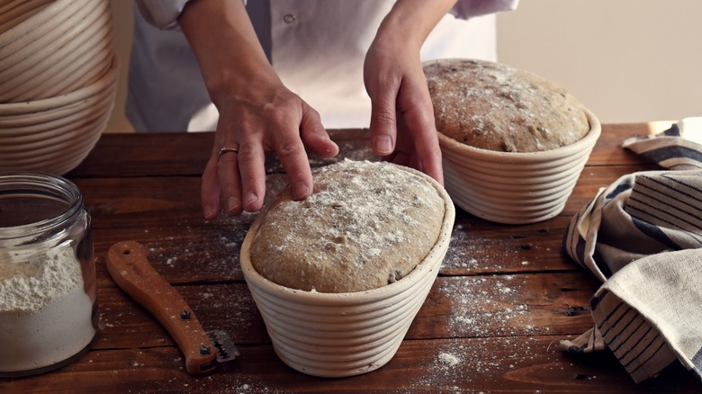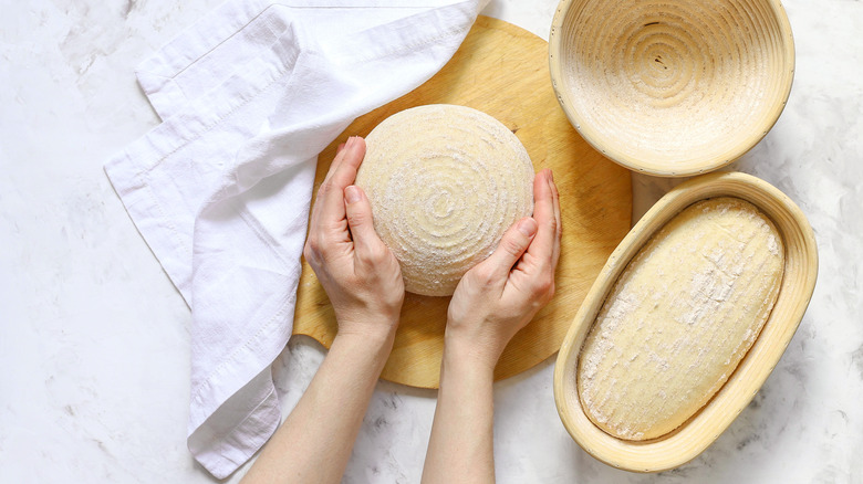 Once you've established which type of proofing basket is best for your bread mix, you must then consider its shape and size. The form of the banneton will determine the shape of your baked loaf. For example, oval proofing baskets will yield oval-shaped loaves, and circular ones will result in round loaves. There are also less common shapes of bannetons, including long, slender ones used for baguettes, triangles, squares, and minis, to name a few. The size of your proofing basket must be determined based on the weight of the dough. For example, if the bread mix is between 350 and 400 grams, a round banneton should be around seven inches in diameter (via The Pantry Mama). This will allow the dough enough room to rise upward without surpassing the surface and keep it from spreading outward entirely.