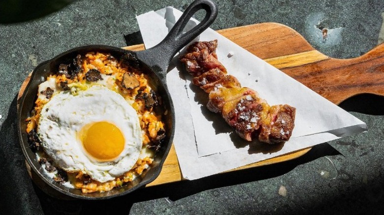 Start off with one of the chef-curated seafood platters to enjoy a variety of some of the restaurant's raw and cooked seafood selections. The spicy scallops are a light yet decadent option that is great for sharing. Pair the meal with one of Cassia's signature cocktails, like the bright and smoky Singapore Smash, which is a balanced combination of Siete Misterios mezcal, lemon, and pineapple.