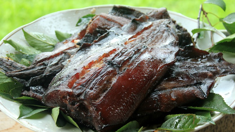 There are several ways to prepare boar, including ribs, dehydrated bacon, and ragu. The nutty taste of the meat pairs well with sweet and acidic flavors like tomatoes, barbecue sauce, and brown sugar. You can also braise the belly of the boar to bring out its buttery flavors. Regardless of the method you choose to use, you should continually heat the meat until the internal temperature is 145 degrees Fahrenheit for whole cuts and 160 degrees Fahrenheit for ground boar. Reaching the precise internal temperature is also essential to kill off any trichinella parasites from the meat (via Petersen's Bowhunting).