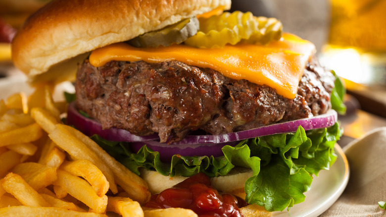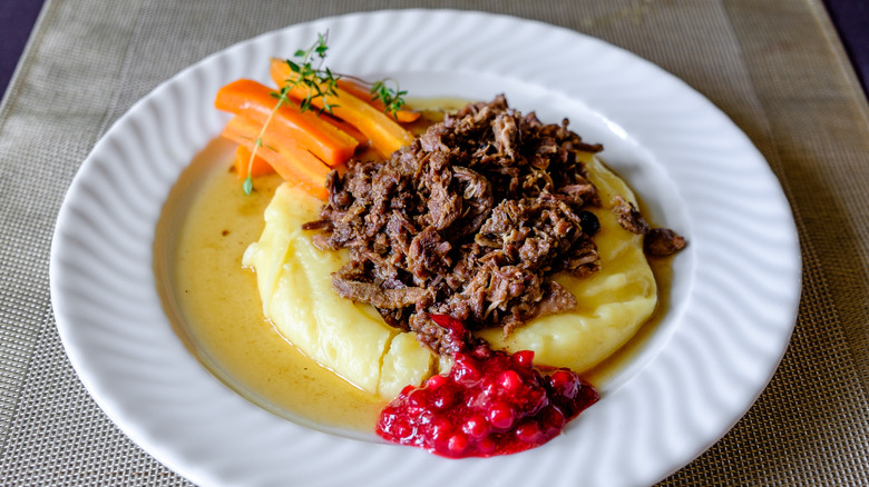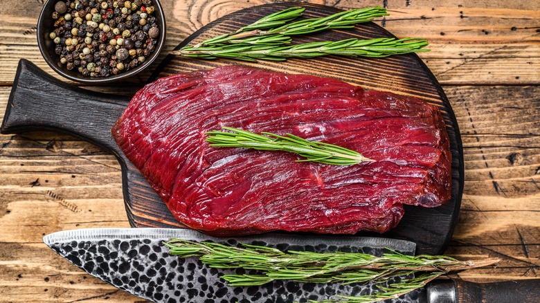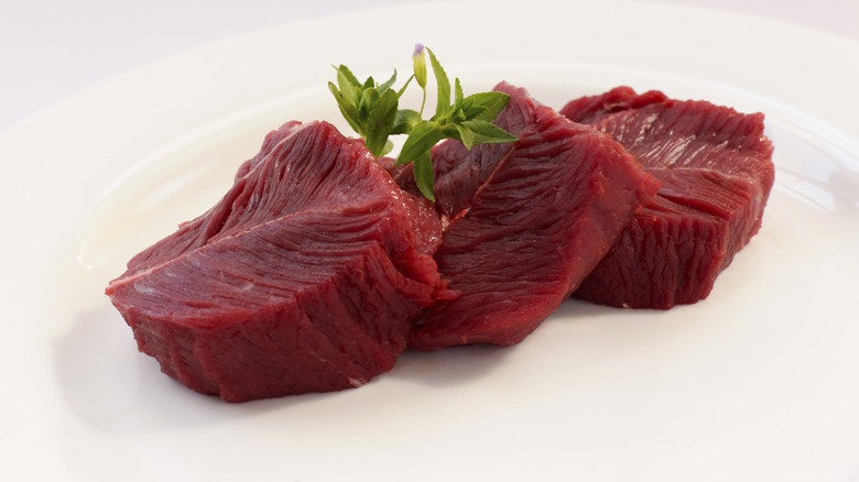 Elk meat has surged in popularity recently because of its flavor and texture. Research conducted by Datassential, as reported by Nation's Restaurant News, notes that the meat's presence on restaurant menus has risen 115% in the last four years. The elk sold in butcher shops or at restaurants has been farmed since the '70s. Since farm-raised elk are fed a forage diet similar to that of cows, including alfalfa and grasses, the meat can taste like ground beef. Wild elk is considerably lean and has a slightly more gamey flavor than farm-raised varieties. It is considered less gamey and fatty than its cousin, venison — otherwise known as deer. Elk is also high in iron, zinc, and phosphorous.