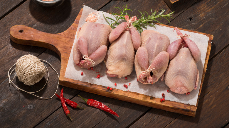 The quail's taste is between a chicken and a duck. The most significant difference between quail, duck, and chicken is the quail's size — which is only about half a pound. The quail bones are tiny and tender, meaning that many of them can be eaten — but you can also purchase semi-boned meat at butcher shops or through special purveyors. Farmed quail can be bought fresh, frozen, or boneless at most grocery stores. These farm-raised birds will taste more like chicken than gamier meat — since their feeding regime is more closely controlled than a bird that is allowed to forage for berries and insects.