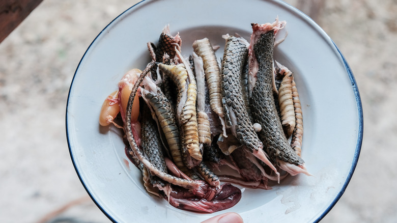 Snake meat can range in flavor from chicken-like to frog-like depending on what the snake ate for its last meal — thus earning it the title "desert whitefish" (via A-Z Animals). The texture is stringy and chewy, which sets it apart from other game meats. Several types of snakes can be eaten (provided that you're brave enough to catch it), including the most popular rattlesnake or the diamondback. The rattlesnake's meat is rubbery and white like alligator meat, with a mild taste like gamey poultry.