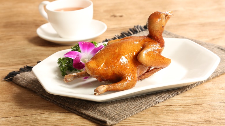 Squab can be broken down, or kept whole and grilled. It can also be stuffed, roasted, braised, or sautéed. Chinese deep-fried squab, Zha Bok Gop, is famous around Chinese New Year Celebrations and holidays. This preparation method involves removing the internal organs and de-clawing the bird, but leaving the legs, tail, and head intact. The bird is then simmered in a broth, coated in a maltose and vinegar seasoning, dried, and deep-fried.