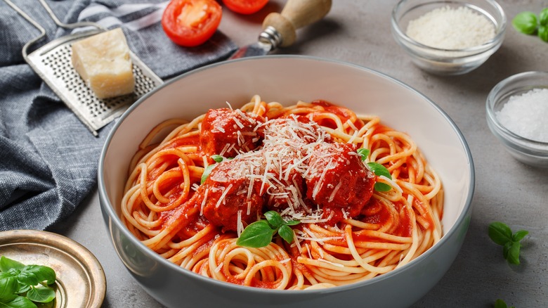 A standard spaghetti cooks in eight minutes. So you cook [the spaghetti for] four minutes in boiling water, you toss it in the tomato that's now being strained, and you let them cook for four minutes [to] finish their cooking in the tomato sauce. This allows the pasta to hydrate in that juice, which makes the spaghetti tomato really, really flavorful because they're absorbing the tomato juice to cook.