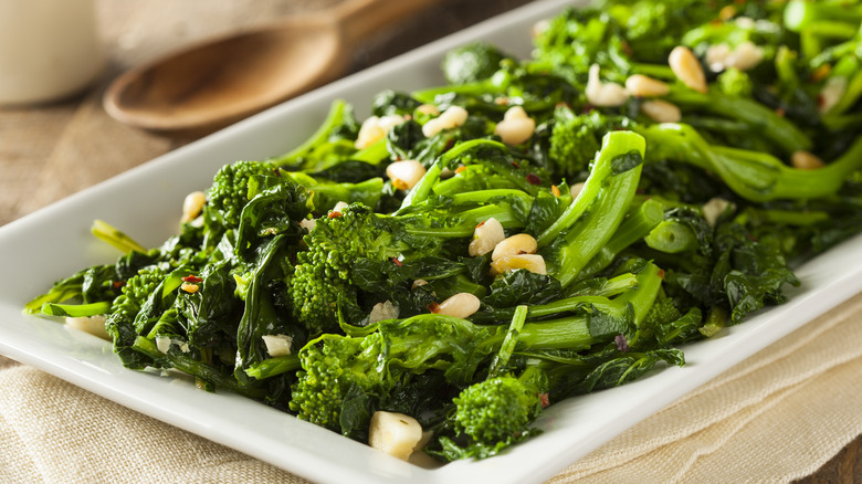 Let the water come out. You add salt, of course, so that it extracts all the water out of the veg. It'll help extract all of the juice out of the broccoli rabe. Then you put the lid on so that you don't let the steam escape. It stays all in. It takes about seven to eight minutes. You take the lid off, [and] you'll see everything soften up. And that's it. I keep it there for another five minutes without the lid on, and then I toss it to the side.