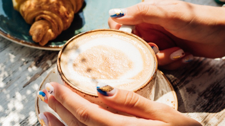 Cappuccinos – not to be confused with babyccinos — are made from espresso topped with equal parts steamed milk and milk foam. According to Andreas Willhoff, director of education at Halfwit Coffee Roasters and the director of operations at The Wormhole in Chicago (via Reader's Digest), cappuccinos technically contain roughly four-to-five ounces of foam. It's fluffier than a latte, and when the barista hands you the cup, it's going to weigh noticeably less than a latte or drip coffee. The milk foam has a much lighter density than steamed milk. This makes for a slightly stronger espresso taste than lattes, as there's less milk to dilute the flavor.