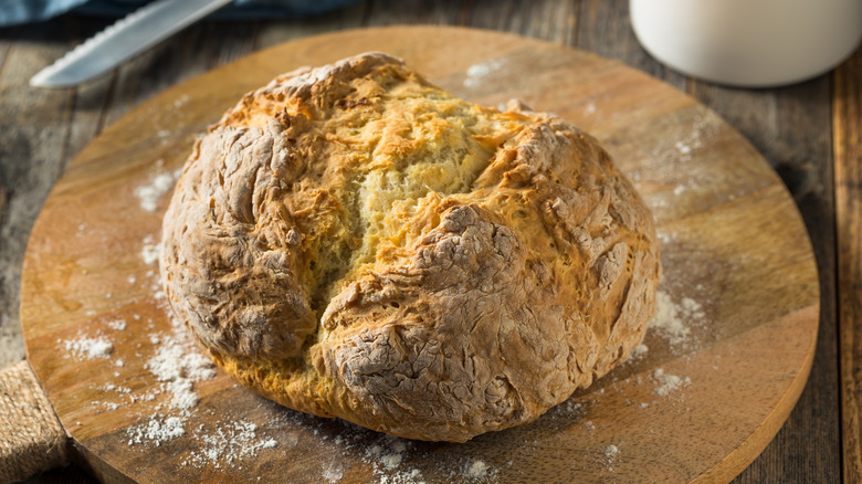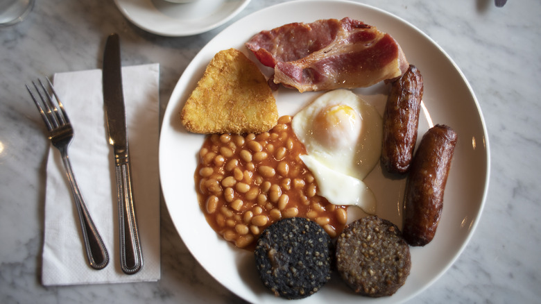 The full Irish breakfast is specifically designed to put some meat on your bones. (Pun intended.) The spread was created by Irish farmers who would fuel up with a large meal at the beginning of a workday. But it's also a decidedly meat-forward dish. The brekky starts off with pork back bacon (locally known as rashers), pork sausage, and black and white pudding. Then comes fried eggs, sauteed button mushrooms, and fried tomatoes. A key component of a full Irish breakfast is soda bread, often enjoyed with Irish butter like Kerrygold. (If you don't happen to live in Dublin, Mary O's in Manhattan cranks out some of the best Irish soda bread in the U.S.) It all gets washed down with a cup of black tea with milk. If you've ever spied "Irish breakfast tea" in your local grocery store's coffee and tea aisle, this is where it gets its name.