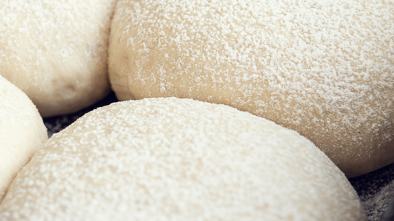 Blaa recipes require generous flour, and bakers use well-floured workspaces to handle the dough in between rises. Throughout the rising steps, buns are coated with sprinklings of flour, and before the dough is placed into the oven, another coating is dusted on top of the rolls. This flour helps give blaa its signature texture and protects the dough while it bakes. Though bakers need patience to make this bread — over four hours of total rising time is required — precision isn't in order. Buns can come in various shapes and sizes and aren't always perfectly-shaped spheres.