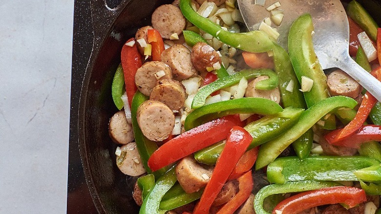 Sure enough, for this recipe, you'll need a package of chicken sausage and a couple of bell peppers. Of course, you can always swap for pork-based sausages like Italian sausage, andouille, or chorizo, but this recipe is designed for the mild, savory taste of chicken sausage. We used pepper-and-onion-flavored sausages, but you can use any sausage that catch your eye — we especially love Cajun-spiced chicken sausages.