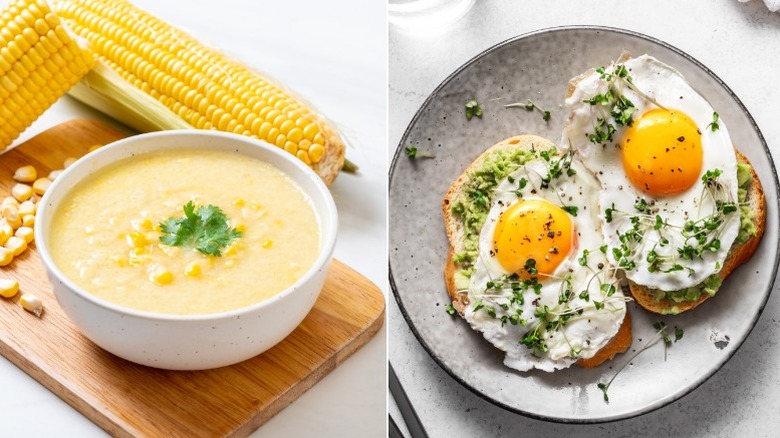 14. Crab and corn chowder and avocado and poached egg toast