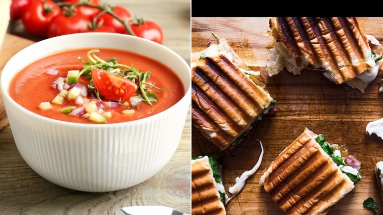 For a good sandwich pairing, try this prosciutto and mozzarella panini with fig jam. The warm sandwich will complement the cool gazpacho, making the combo extra appetizing for warm and cold weather alike. This does require a panini press, but if you don't have one, approximating the sandwich on a stovetop can work well too.