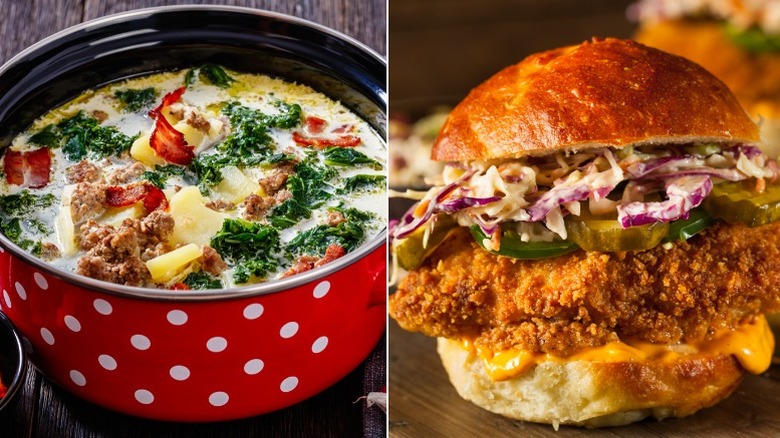 For an innovative Southwestern or Mexican twist on the "soup and sandwich" concept, try pairing our black bean soup with crispy chicken quesadillas (and yes, a bunch of ingredients placed between hand-held carbs constitutes a sandwich for us). The soup offers a protein-rich, wholly vegan dish that combines black beans with onion, canned tomatoes, green chilis, and Southwestern spices like cumin and chili powder to produce a chili-esque bowl. While the recipe calls for an immersion blender, it can be left as chunky as you like, or puréed (even in part) in a food processor or standard blender.
