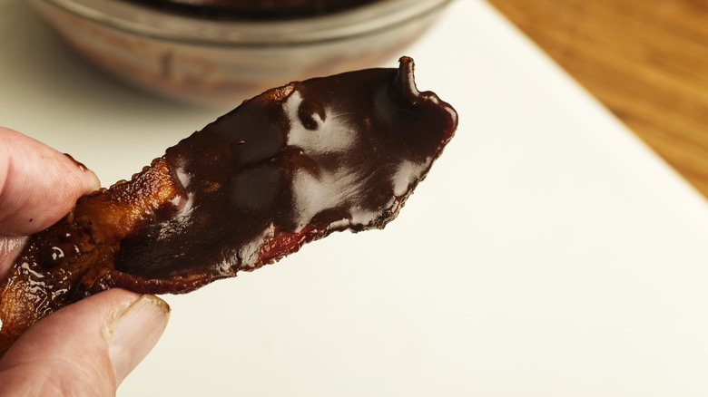 For easier dipping and a gratifying crunch, whip up a batch of extra-crispy bacon. Place the strips on a wire rack over a baking sheet so the grease drains and bake them at high heat. The crispy strips will be sturdier and more conveniently dippable, allowing you to savor the tantalizing flavor combination with zero mess.