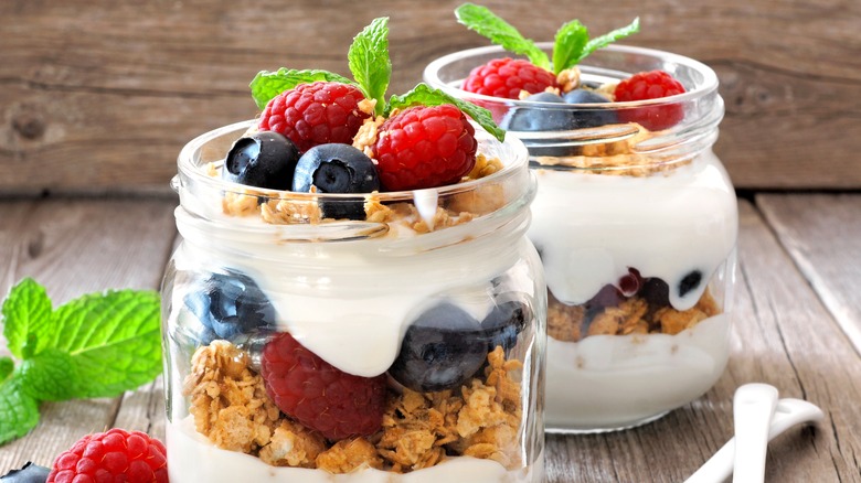 If you want your parfaits to be Instagram-perfect, and ready for their close-up, you want to use fresh fruit. Fresh fruit's structure is still going to be sturdy and rigid, and it won't become a mushy mess like frozen fruit. Unfortunately, fresh fruit's taste can be hit or miss if it isn't in season. However, one of the benefits of using fresh fruit is you can prep and make your parfaits in advance of when you plan to serve them. But if you do make them ahead of time, make certain you don't add granola until you are ready to serve or it might wind up soggy. Of course, if you don't like granola crisp and crunchy, pile it on ahead of time and it will soften up.