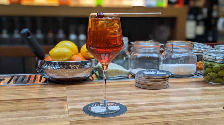 Essentially a Manhattan with tea and using bourbon instead of rye, the lightly embittered drink passed as much less heavy fare than the generous pour of bourbon suggested. If you like Long Island iced tea, here's a similarly stealthy pour. (That the name change mentions neither Manhattan nor Long Island may be taken as a bit of détente here at the departure point between the two.) Those who want to try bourbon without suffering a grimace at first taste will find this smooth sipping, almost like a soft drink.