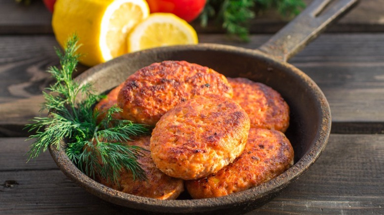Salmon cakes have quick cooking times, no matter how you plan to warm them up. Some fry them in a pan, while others bake their batch. Regardless, you'll get away with adding herbs like baby dill, fresh parsley, chives, mint, and green onion without breaking them down too much.
