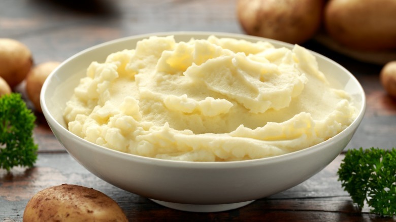 Breadcrumbs combined with an egg, some mayonnaise, and a few other flavorful additions are commonly used to help keep the flakey fish within the patty so it won't fall apart. Mashed potatoes work beautifully in the same way. Flaked salmon, mashed potatoes, and egg come together when it's time to form those patties, but your potatoes must be just right.