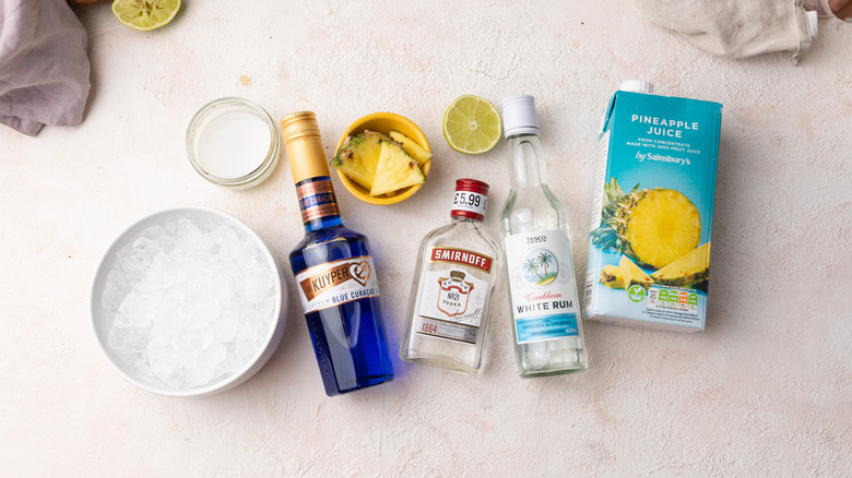 You will only need to get a few ingredients to make this tropical drink. Pick up blue curaçao, white rum, vodka, pineapple juice, coconut milk, lime, and sliced pineapple. The recipe also calls for 1 optional ingredient — a maraschino cherry to garnish.