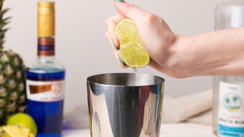 Add the blue curaçao, white rum, vodka, pineapple juice, and coconut milk to the cocktail shaker. Then, add the lime juice, and ice to the cocktail shaker. Place the lid back on the shaker, and vigorously shake for 15 seconds, until the cocktail shaker is cold to the touch.
