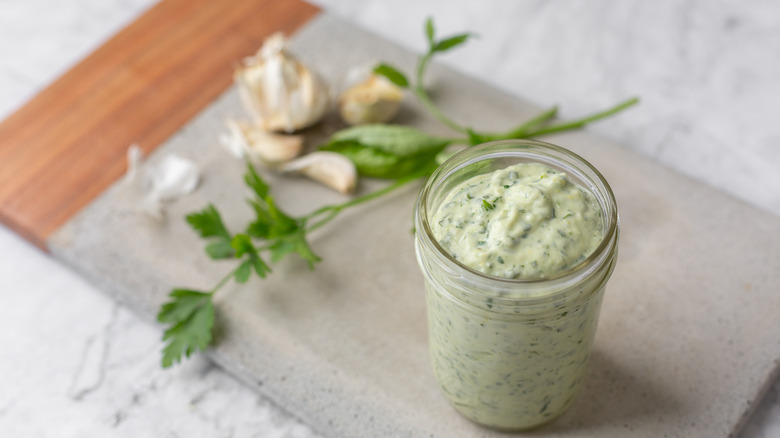 Ranch salad dressing is probably the most beloved and popular salad dressing on the planet. What's not to love about a sauce that can be used on a salad or for dipping hot wings in? However, as great as ranch dressing may be, homemade green goddess salad dressing can't be beat. It's tangy flavor is one that can make salad greens and raw vegetables even more delicious. First concocted in the Palace's Garden Court Restaurant in San Francisco, California in the 1920s, this velvety smooth and savory dressing traditionally uses ice, pasteurized eggs, whole grain mustard, shallots, capers, chives, spinach, fresh tarragon, chopped parsley, tarragon vinaigrette, salt and pepper, some olive oil, and lemon juice to create its signature taste.