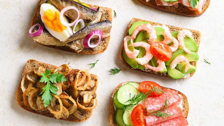 Ideally, the toppings should be traditionally Scandinavian to honor the dish's area of birth. This is why it's common to see pickled herring, small shrimp, boiled eggs, and salmon on top of smørrebrød. But the toppings certainly are not limited to these elements. Like French tartines or Italian bruschetta, you really can put almost anything on smørrebrød, even last night's leftovers as those Danish factory workers did. Aside from meat or fish, vegetables can top the bread and butter such as pickled beets, onions, kale, avocado, potatoes, and cucumber pickles. And smørrebrød wouldn't be complete without garnishes like fresh herbs, nuts, and horseradish. In essence, smørrebrød can be an entire meal on top of a single slice of bread.