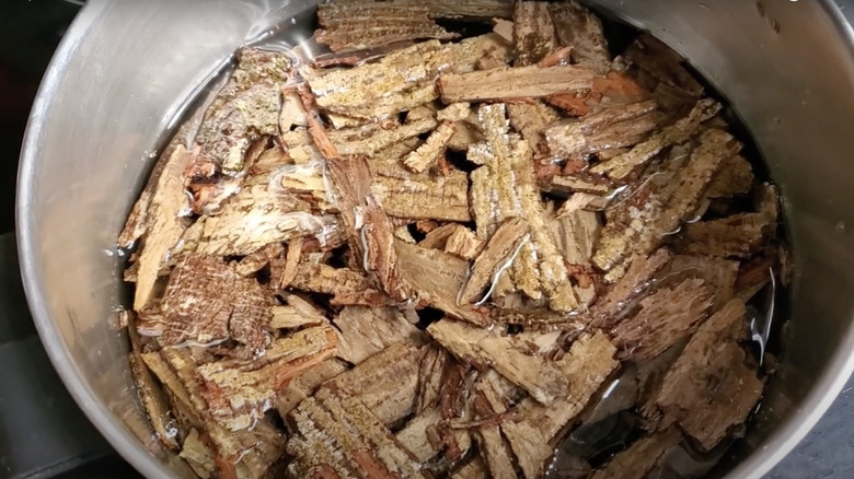 At home, using bark that's relatively clean of moss and mold, you'll scrub the bark in a bowl of warm water, then let it soak for 15 minutes. You'll drain it, transfer it to a baking dish, and roast it at 400 degrees Fahrenheit for 25 minutes. Once it's cooled, you'll break it into smaller pieces, then simmer it with enough clean water to cover for about 30 minutes, making the shagbark "tea." You'll strain out the bark, then, in a saucepan, add 1 cup of sugar for every cup of tea, bring the mixture to 225 degrees Fahrenheit on a candy thermometer, then pour the hot liquid into clean glass jars and seal them. Hickory syrup will last a long time in the pantry, but be sure to refrigerate it after opening it to avoid spoilage.