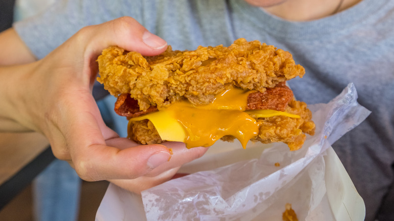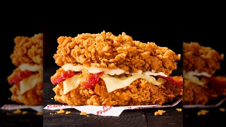 In the world of fast food, there's never a shortage of strange specialty items. Some of these items pop up in select markets for just a few weeks before vanishing without a trace, leaving those who taste-tested them to wonder if they were ever real, while others manage to get a wide-scale release, only to court controversy before being discarded to history's trash bin of forgotten food experiments. Yet every so often a product so strange — and so controversial — comes around that it manages to implant itself in our collective subconscious, either as something truly horrifying or so outrageous it was actually brilliant. And often, these snacks are one and the same, depending on who you ask. Enter the KFC Double Down.