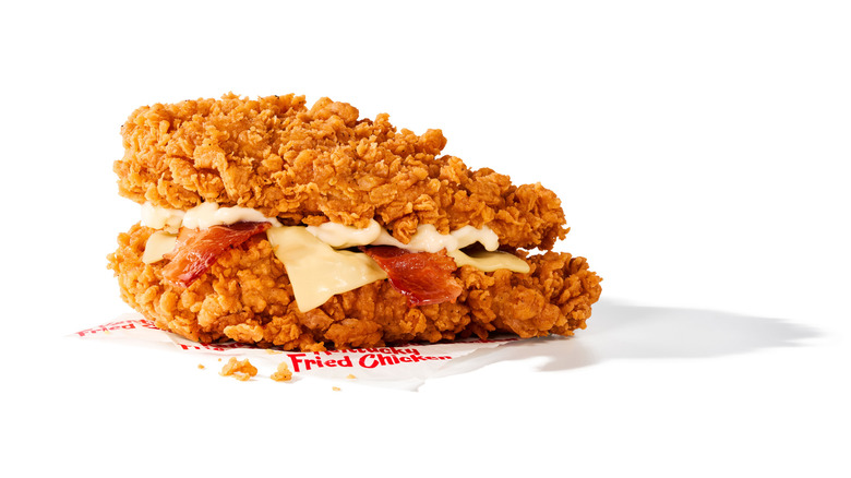 KFC recently announced that its unique take on the chicken sandwich will be returning to the U.S. for a limited time starting March 6, likely to the thrill and horror of many. The Double Down, for those who are unfamiliar, is a sandwich consisting of two extra-crispy white meat chicken patties, bacon, cheese, and sauce, which doesn't sound that over-the-top until you realize that the sandwich is bun-less and the fried chicken actually substitutes for bread. Originally released in spring 2010, the Double Down achieved a sort of have-to-try-it infamy, with the New York Times calling it a "must-to-avoid" and Stephen Colbert defiantly eating one on "The Colbert Report" and deeming it "good" after a comical tirade condemning the fried creation. The media attention only spurred sales, leading KFC to extend the run of the Double Down until it was eventually discontinued in 2014.