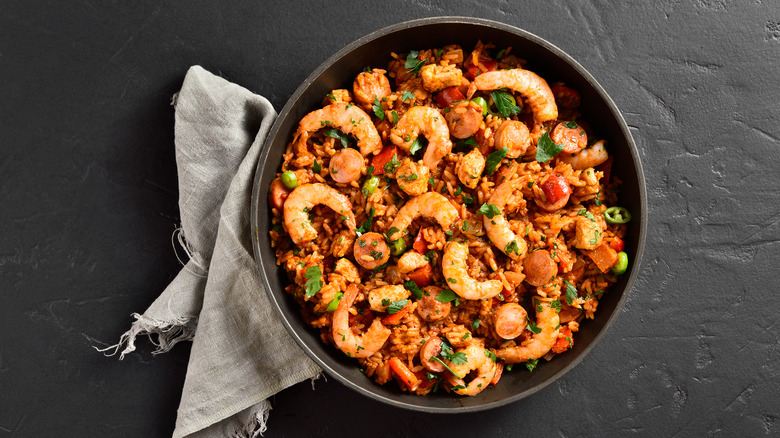 Famous for being a staple dish from Louisiana, jambalaya comes in two varieties: Creole and Cajun. It's believed that jambalaya is an evolution of the Spanish dish, paella, loaded with rice and seafood. In metropolitan New Orleans, the saffron that gives paella its signature yellow hue was replaced with the more easily sourced tomatoes. Hence Creole jambalaya is often called "red" jambalaya. As the dish proliferated out away from the city and into the bayou, even tomatoes were hard to come by, meaning that the flavor of the dish relied more on the caramelization of the meat and rice, giving the Cajun version a toasted look and the moniker "brown" jambalaya.