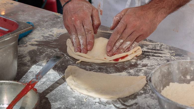 Once the calzone hit the streets of America, it transformed from street food into a regular menu item in many Italian restaurants. Now being offered as a sit-down meal, the size of calzones began to expand, as did the filling options. Today, a calzone's filling is only limited by your imagination. Typically, anything you put on a pizza you can put into a calzone, including vegetables and herbs. Ricotta cheese is also a popular cheese filling — since it's wet, it doesn't hold up well on top of pizza but stuffed into sturdy calzones, it gets soft and combines deliciously with mozzarella. Marinara sauce is usually still served on the side for dipping.