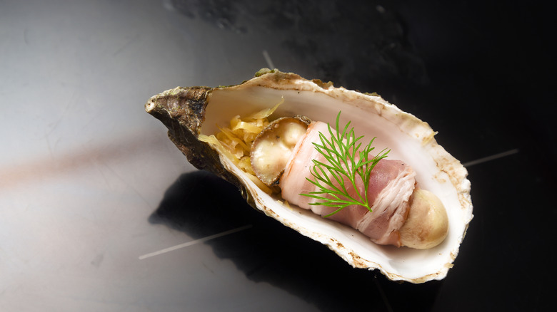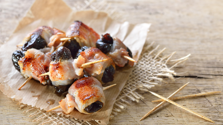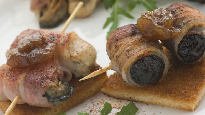 British Food: A History recommends first soaking the prunes in tea before stuffing them with almonds and wrapping them in bacon, using a toothpick to affix the meat once again. Other recipes recommend using soft cheese or chutney as a filling instead, though originally, no filling was required — just prunes and bacon. If you are not a prune fan, dates can also be substituted for prunes in this recipe, much like scallops work as an alternative to oysters. Serve them with their bacon-wrapped shellfish counterparts, and you have a sweet and savory appetizer combination made in Heaven (or Hell).