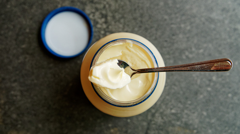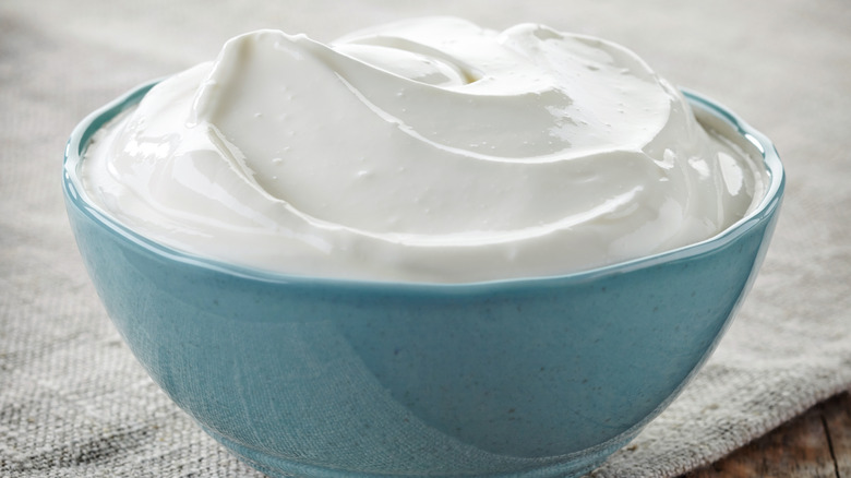 If you want a well-rounded cake made from a boxed mix that rivals cakes made from scratch, consider adding plain yogurt to the mix. Yogurt is made by adding a bacteria culture to milk, and the fermentation gives yogurt the signature sour taste. When you add yogurt to a boxed cake mix, the sourness of the yogurt contrasts with the sugar that is in the mix, resulting in a balanced flavor profile. In addition to reducing the sweetness of the cake, the yogurt's acidity also helps to activate baking soda in the cake mix, making the cake lighter and fluffier.