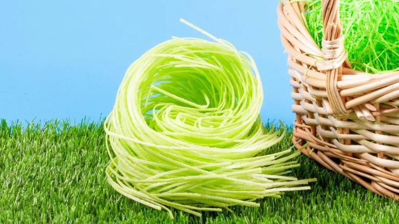While some people might try to make their own edible grass home out of desiccated coconut, fondant, or rice paper, buying pre-made edible grass is so much easier. But if you are wondering what this Easter treat could possibly be made from and how, a few people have tried replicating it on their own. According to Walmart's product page, Galerie Candy's edible Easter grass contains potato starch, cornstarch, modified cornstarch, artificial flavor, acesulfame potassium, aspartame, and artificial colors such as yellow 5, red 40, and blue 2. Flavors of the edible grass include green apple, blueberry, strawberry, and banana.