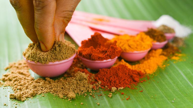 However, if you're blooming more than one spice for a biryani recipe, keep the saffron separate for its own process. The delicacy of saffron threads requires a gentler hand and milder liquid, typically water, milk, or chicken broth. There are two common methods for blooming saffron, one using hot water and another using ice cubes. Both blooming processes call for eight to 10 saffron threads that are ground into a powder. Traditional customs call for grinding with a mortar and pestle, but the back of a spoon will suffice. The delicate stems will crush easily with minimal pressure.