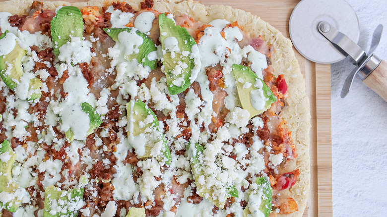 Whether it's breakfast, lunch, or dinner, it's always a good time to enjoy a pizza. Whoever said you couldn't eat pizza for breakfast was sorely mistaken and this Mexican breakfast pizza recipe proves it! While most of us know pizza for having a layer of crust, followed by red sauce, and then cheese and whatever other toppings you enjoy, there are several different ways to fix up a pizza, and it's especially fun to get creative. Not only can you enjoy this pizza bright and early in the morning, but it's got a fun Mexican spin with ingredients like salsa-filled eggs, chorizo, cotija cheese, and a cilantro lime crema that will knock your socks off. Trust us, each bite is bursting with flavor.