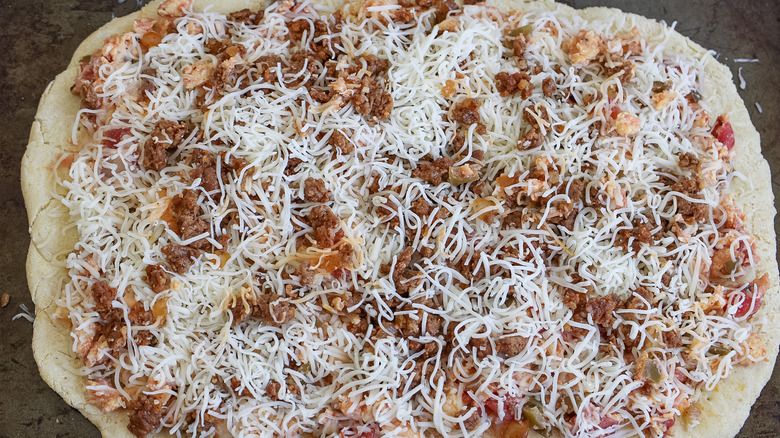 Pizza, assemble! First, spoon the cooked eggs in an even layer over the pizza crust. Then sprinkle half of the Monterey jack cheese and chorizo over the top of the eggs. After the chorizo layer, add the remaining half of Monterey Jack cheese.